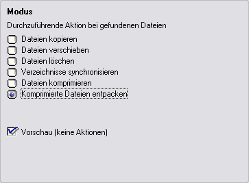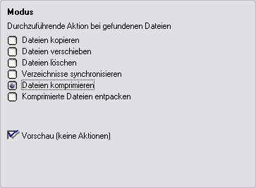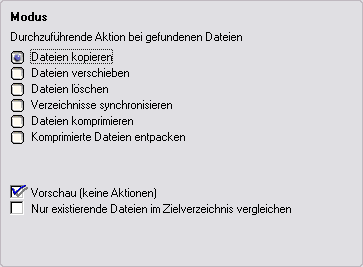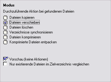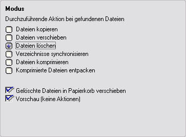 Hier wird der Modus des Auftrages gewählt. Das Ergebnis der Dateisuche