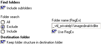 automatically and will be included in the search. Synchronization of filesSynchronization can be done with two different jobs. One compares the files in the destination folder and the other compared the files in the source folder from the first job. The synchronization can be fine tuned by the search settings. Select overwrite if files are older in both jobs. Exclude foldersFinds the user Karl E. Maij and all subfolders except the folder Cookies (and except the subfolders of Cookies) and except the folder real (and except the subfolders of real). The folder 'cookies' or 'real' can be every where in the path below the user <profile>\Karl E. Maij\: Karl E\. Maij(?!.*cookies|.*real) Find folder name^Foldername$ Find a date^(3[01]|0[1-9]|[12]\d)\/(0[1-9]|1[012])\/\d{4} Find an Email address^\w+([\.-]?\w+)*@\w+([\.-]?\w+)*(\.\w{2,})+$ There will be more information about FileMove Pro related RegExes in the coming online FAQ. Check the website www.sitedesign.ch/filemove/pro/ If you figured out a genial pattern and you want to share it with other users then please send it to support@sitedesign.ch There is more and extended information and examples in the internet see Google.